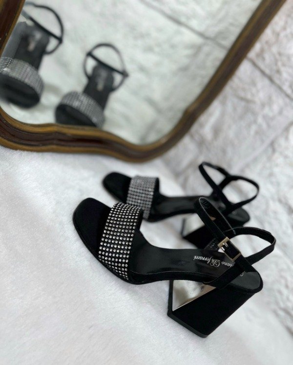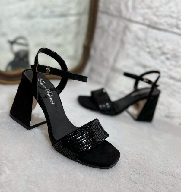 Material ecocuero gamuza con strass en plata, y con fantasia en negro.